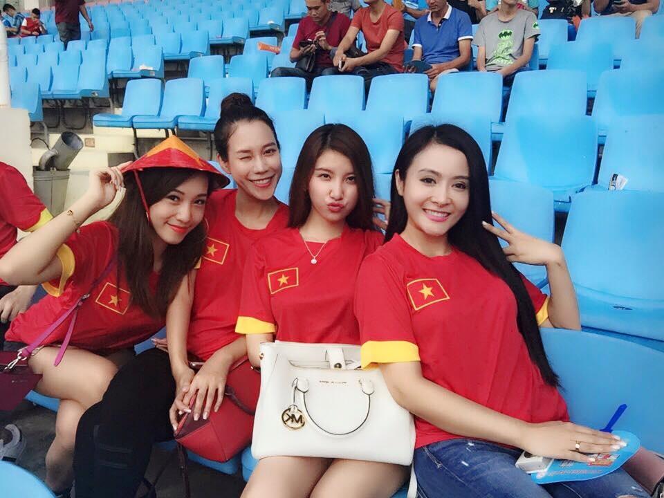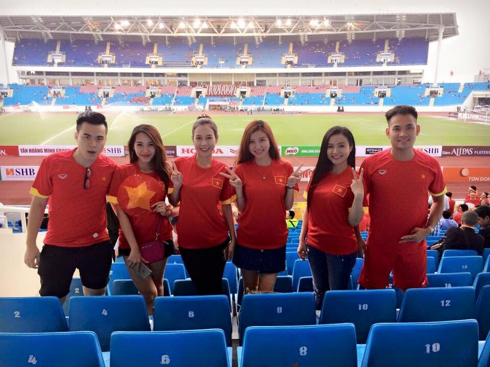 Trên trang cá nhân, cặp bạn thân Emily - Hạnh Sino chia sẻ các hình ảnh trong màu áo cờ đỏ sao vàng, đến sân Mỹ Đình ủng hộ đội tuyển Việt Nam. Đi cùng hai hot girl Hà Thành còn có Đậu Trà My - bà xã của cầu thủ Mai Tiến Thành và Phạm Thúy Loan - chị gái hot girl Huyền Baby.