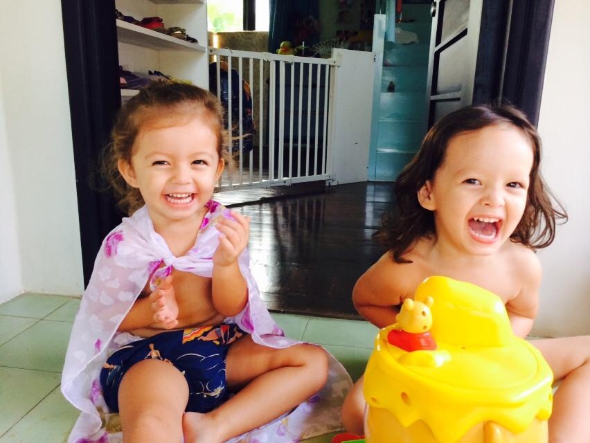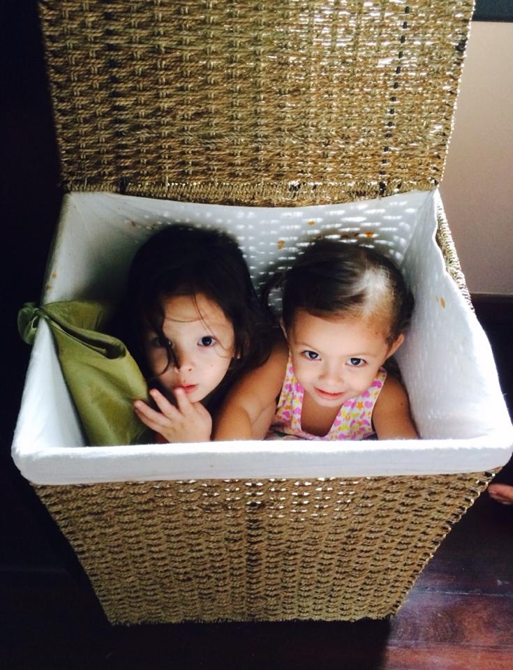 | Tôm và Tép tinh nghịch chui vào chiếc giỏ đựng đồ. Hồng Nhung chia sẻ ảnh và viết: "Hạnh phúc giản đơn. Sáng chủ nhật của hai em". |