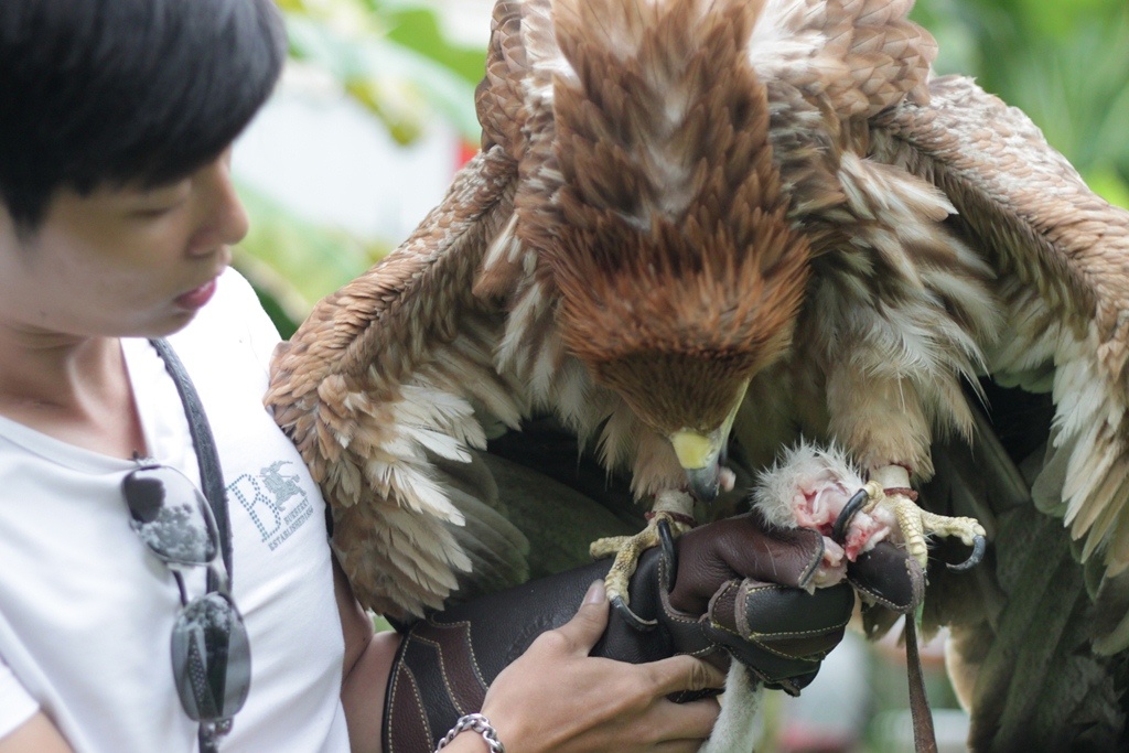 | Chim đại bàng khá hung dữ khi được cho ăn, nên phải dùng đến còi hiệu lệnh điều khiển. Hai anh em cho biết, dù được nuôi nấng nhưng với bản năng là loài thú săn mồi nên giống chim này rất dữ dằn. Hai anh em thường bị chim tấn công, dẫn đến chảy máu ở tay, chân. |