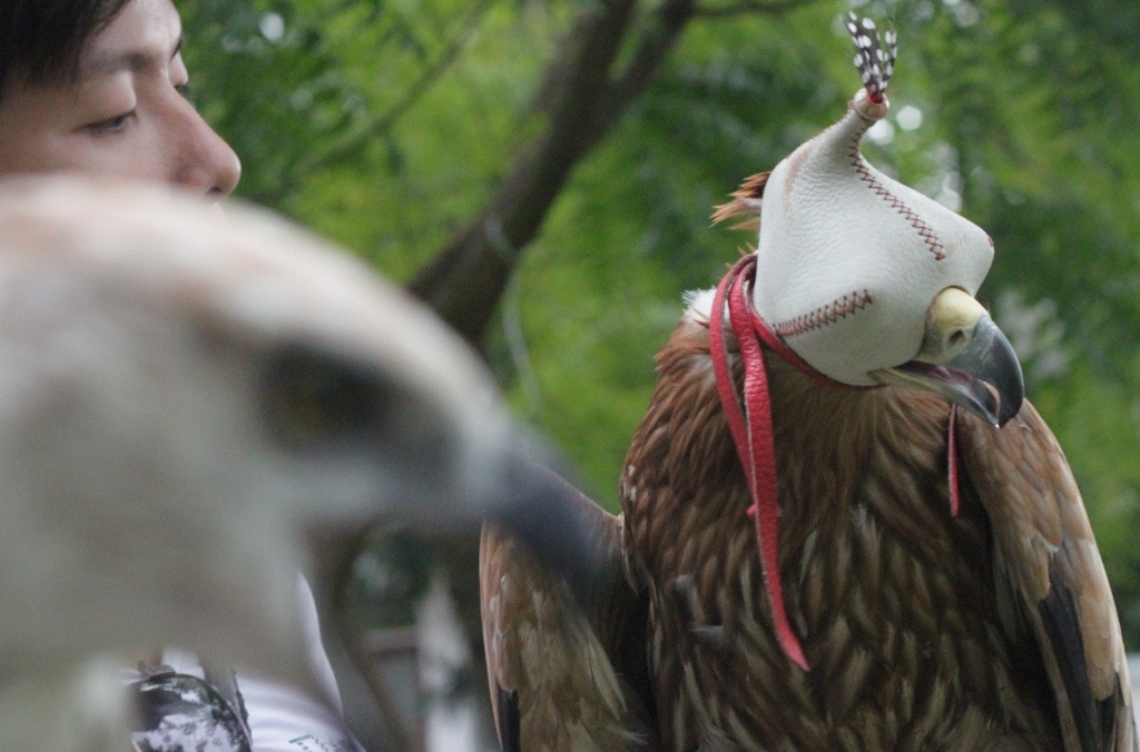 | Mỗi con chim đại bàng đều có mũ đội kín mắt để kiểm soát, nhất là những lúc chim hung hăng khi tập săn mồi. Tất cả vật dụng đều do hai người xem mẫu mã từ nước ngoài và thiết kế lại. |