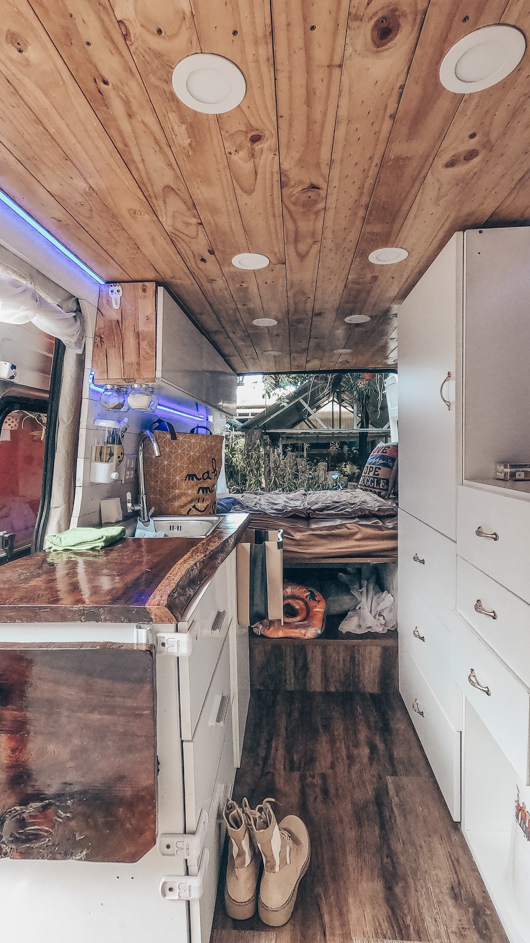 | Sau 2 lần cải tạo, tôi biến thùng xe thành ngôi nhà nhỏ với tiện nghi sinh hoạt cơ bản như giường, bàn bếp, bồn rửa, tủ lạnh, tủ đồ, bàn làm việc, vòi tắm và toilet. Vật liệu được dùng chủ yếu là gỗ thông, đồ chạy điện đều sử dụng năng lượng mặt trời. Chi phí làm nội thất hết khoảng hơn 100 triệu đồng. |