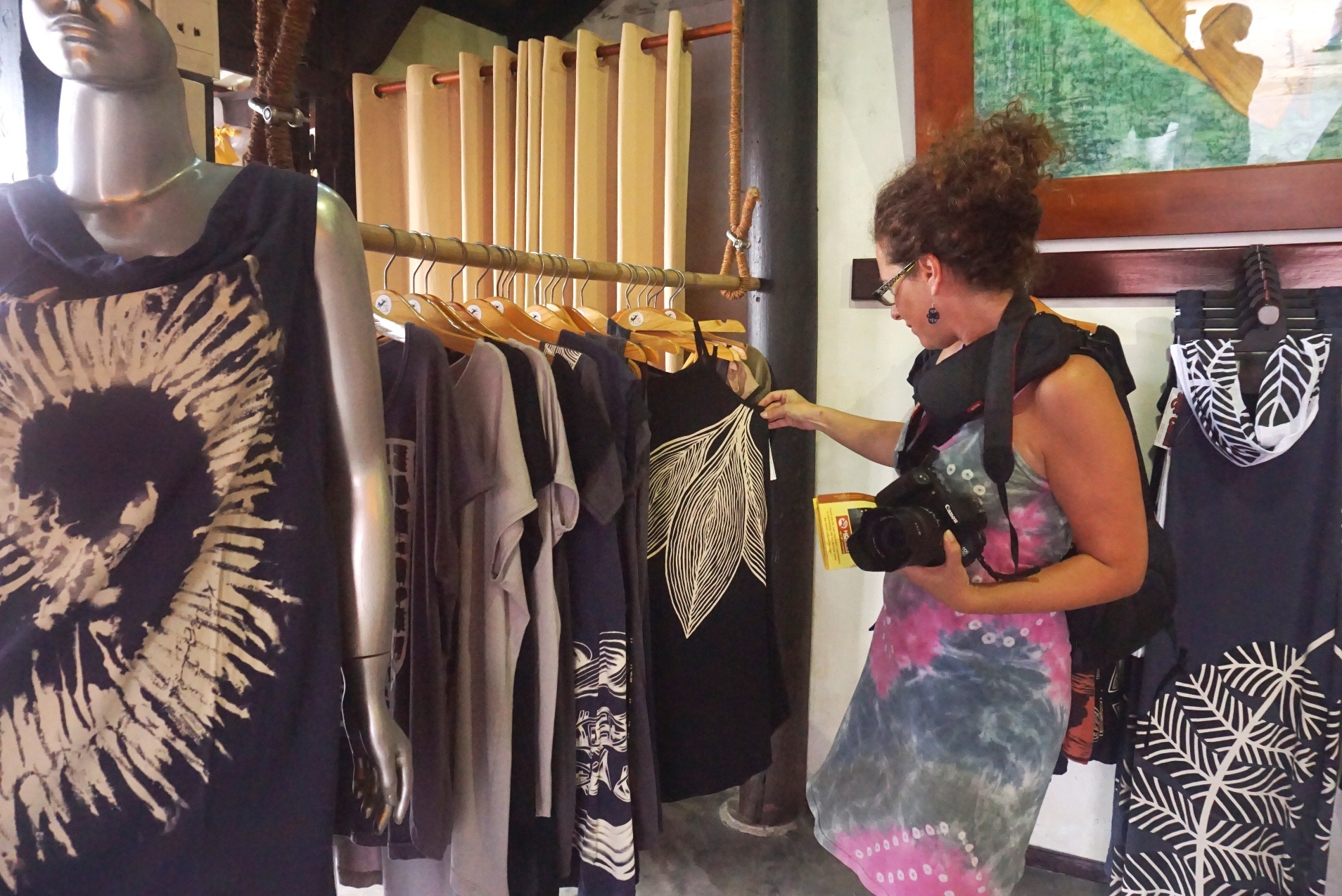 Chọn kiểu khá đại khái nhưng lại nhìn ngắm rất kỹ màu sắc và các hoa văn in trên mỗi chiếc váy, sau vài ba phút lựa chọn, chị Anna quyết định nhanh những sản phẩm mình sẽ mua từ váy, bikini tới khăn quàng, túi xách. “Quần áo ở đây thân thiện về kiểu dáng, chất liệu cotton rất thoải mái, thiết kế hợp gu dân du lịch. Nhưng điều tôi ấn tượng là ở các họa tiết in nghệ thuật trên sản phẩm, điều này mang lại cảm giác mới mẻ cho người mặc”, chị nói. Theo chị, giá quần áo tại cửa hàng khá rẻ so với chất lượng.