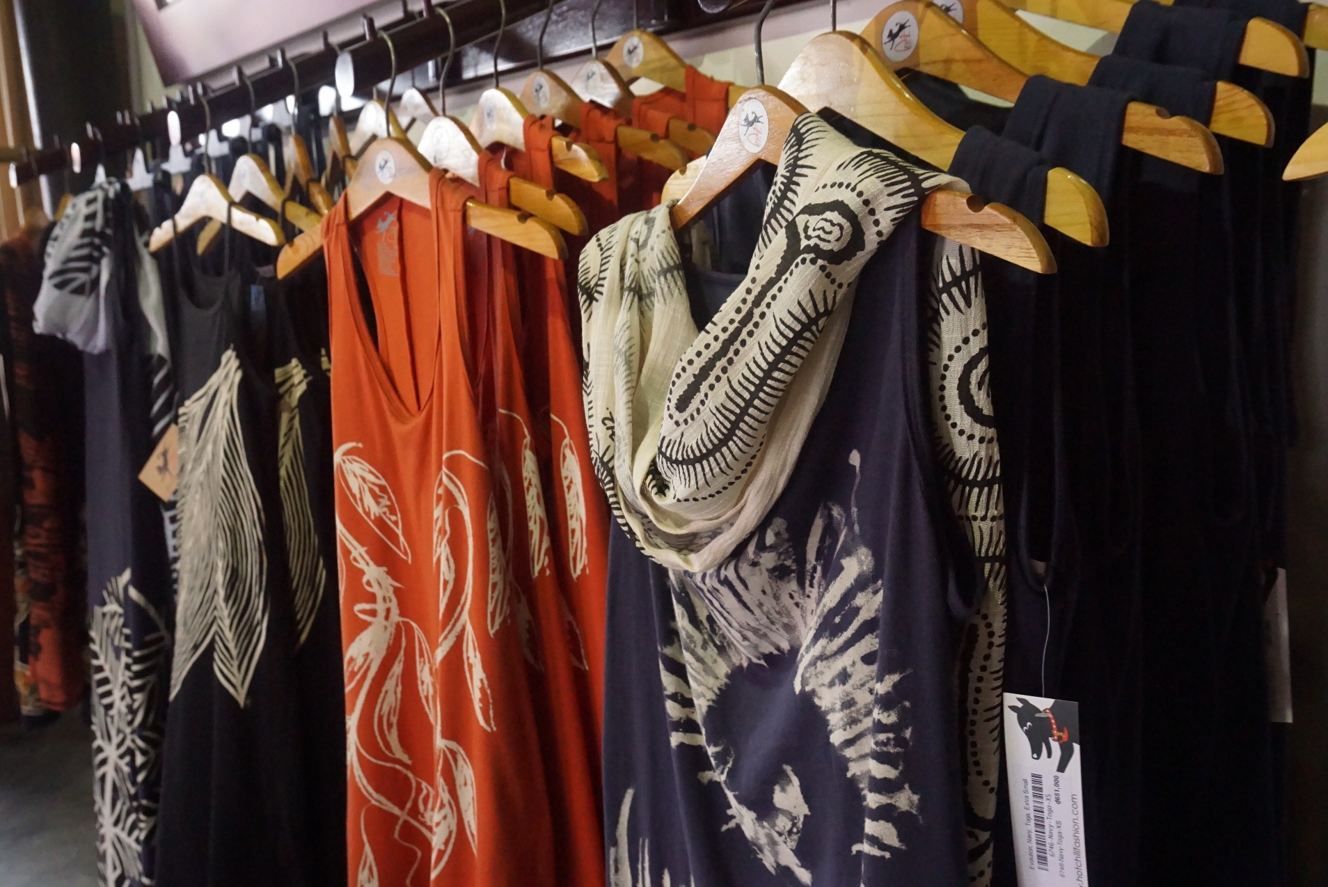 | Sản phẩm quần áo thời trang in hoa văn nghệ thuật mang dấu ấn Việt Nam hút khách Tây. Ảnh: Diệp Sa. |
