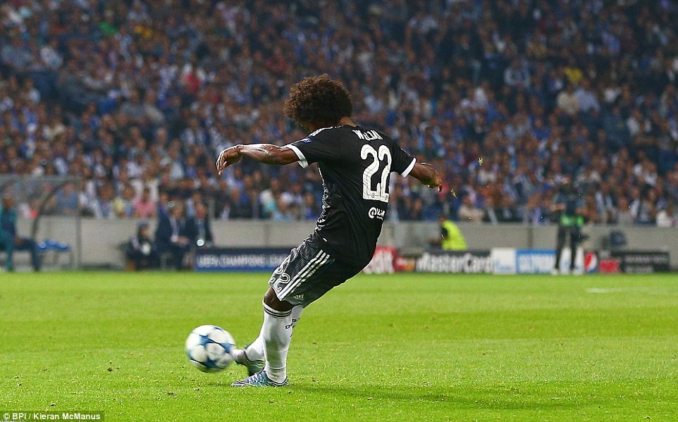 | Tiền vệ người Brazil thực hiện pha sút phạt cứa lòng đẹp mắt gỡ hòa 1-1 cho Chelsea trước khi hiệp 1 khép lại. |
