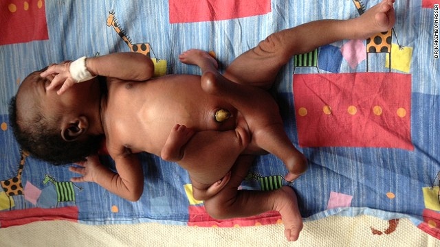 Tại bệnh viện, các bác sĩ phát hiện cặp chân tay thừa là của một thai nhi khác dính liền với cơ thể bé Paul Mukisa. Tuy nhiên, thai nhi song sinh không phát triển đầy đủ, khiến cơ thể bé Mukisa mang những điểm dị thường. Các kiểm tra cho thấy việc phẫu thuật loại bỏ các chi không gây ảnh hưởng tới sức khỏe và sự phát triển của cậu bé.