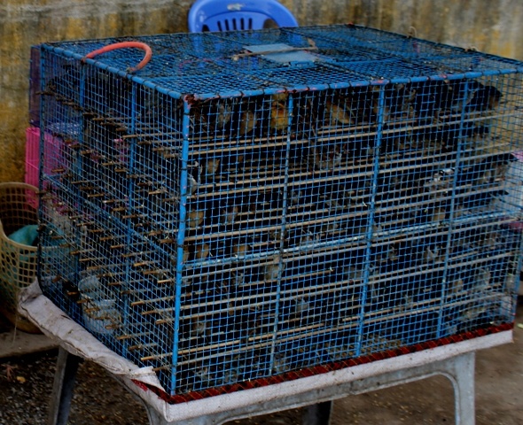 | Chim phóng sinh giẫm đạp nhau trong lồng sắt chật hẹp. |