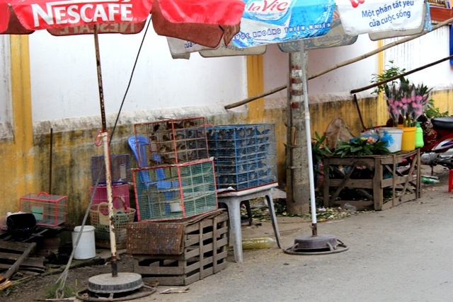| Buôn bán chim phóng sinh dọc đường vào chùa Hoằng Pháp. |