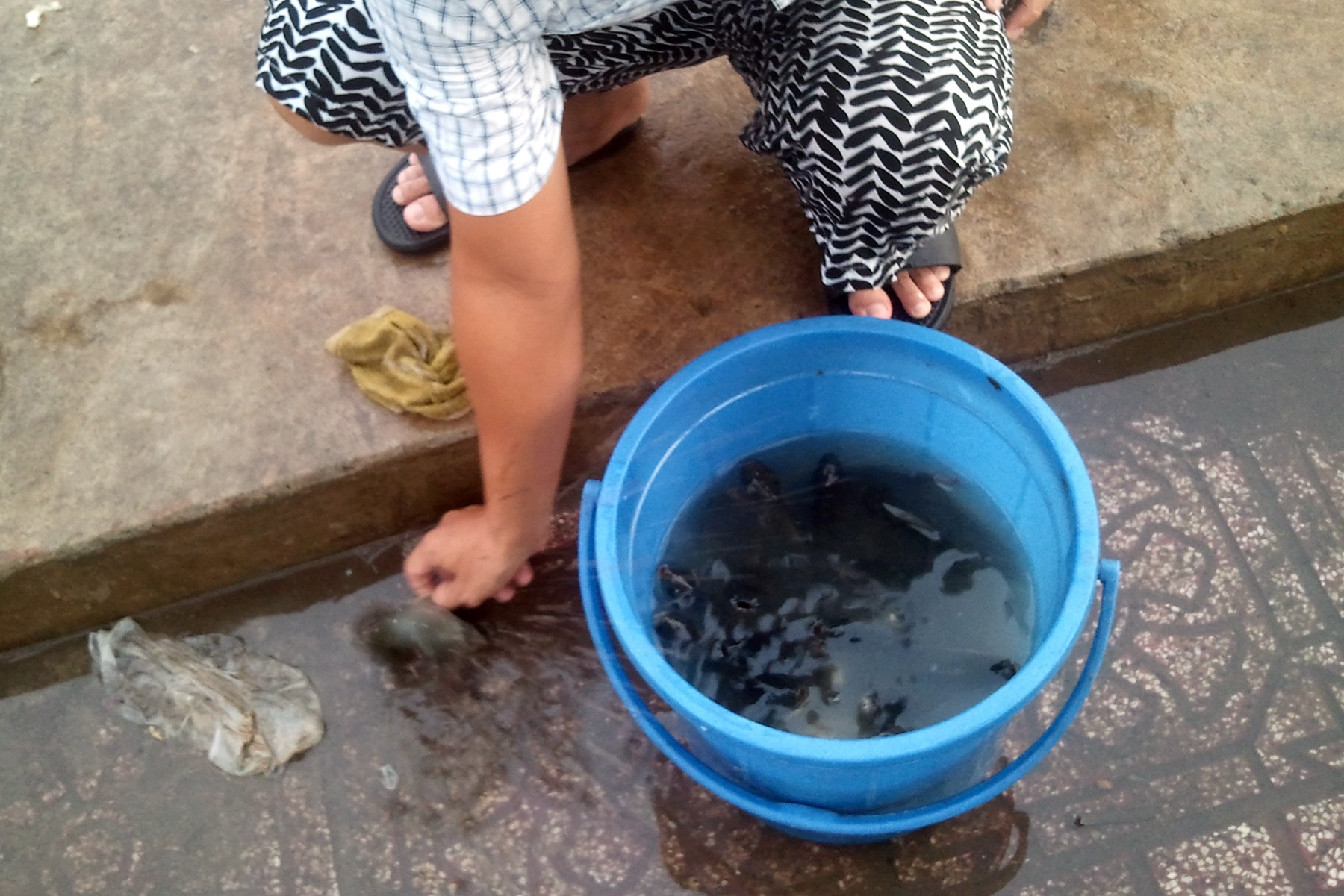 | Cá trên dòng kênh này cũng thường bị chết hàng loạt vì nước bị ô nhiễm khi có mưa lớn. Các công nhân môi trường vớt xác cả chết dọc bờ kênh. |
