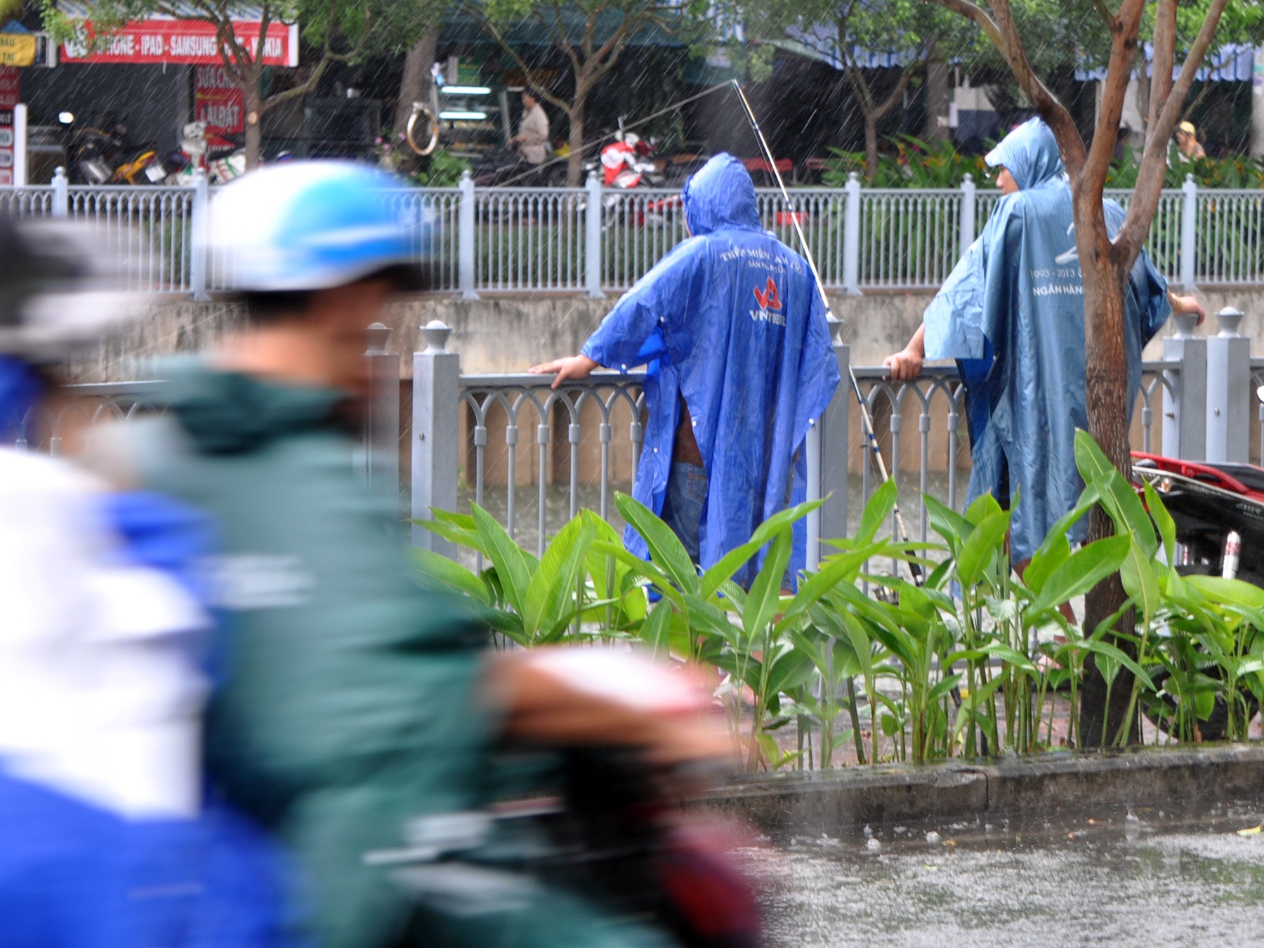 | Bất chấp mưa to, nhiều người vẫn đứng thả câu. |