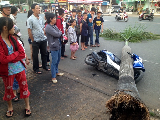 Vừa dừng xe thì nghe tiếng “rắc, rắc…” phía trong lề. Nghĩ là cây ngã hoặc bị tét nhánh nên chị vội bỏ xe rồi nắm tay người bạn kéo chạy ra chỗ khác. Vừa rời khỏi xe được 2m thì cây cau bụng đã ngã đè ngay phần giữa chiếc xe máy.
