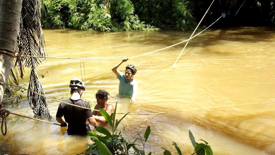 | Hiếu và hướng dẫn viên là dân bản địa hỗ trợ du khách vượt sông. Ảnh: NVCC. |