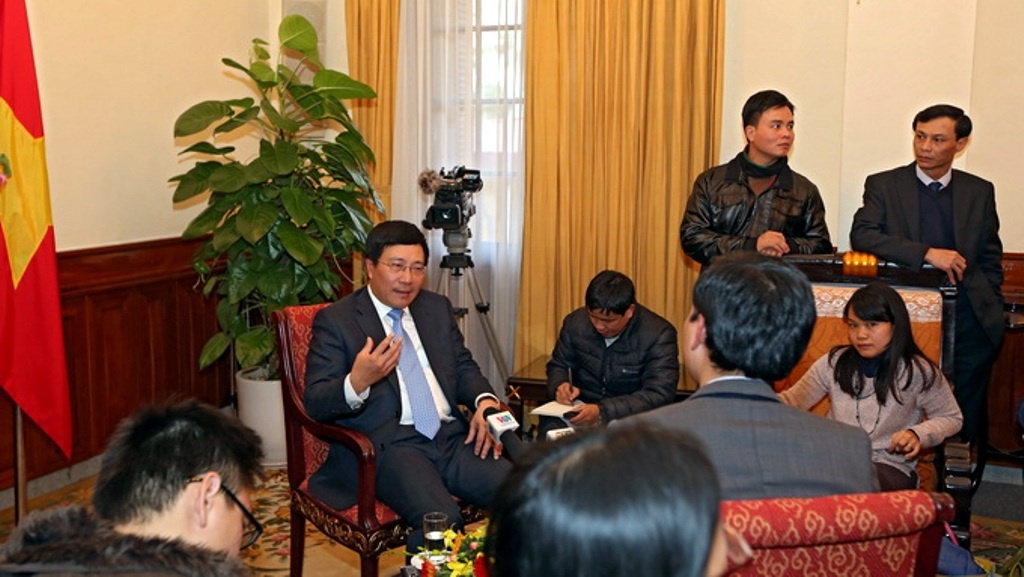 | Phó thủ tướng-Bộ trưởng Ngoại giao Phạm Bình Minh trả lời phỏng vấn một số cơ quan báo chí VN ngày 31/12/2013 tại trụ sở Bộ Ngoại giao. |
