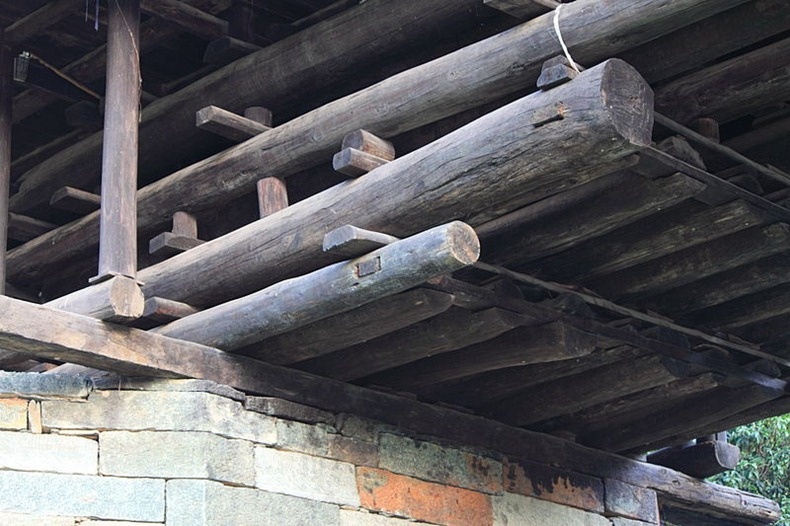 | Các cột trụ lực làm bằng đá, phần kiến trúc bên trên bằng gỗ và lợp ngói trên các vòng gác. |