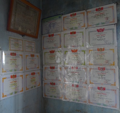 | Một góc tường trong căn nhà xập xệ sáng rực, dán kín giấy khen của Nam. |