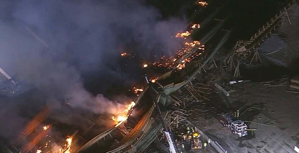 | Cây cầu khổng lồ giờ biến thành tro tàn và sắt vụn. |