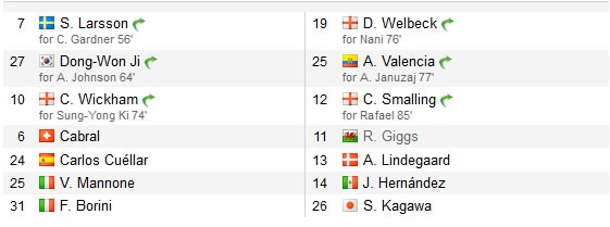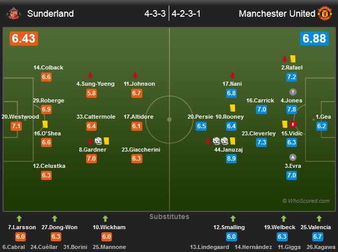 Trong trận gặp Sunderland, HLV David Moyes tiếp tục có sự điều chỉnh đội hình xuất phát. Ở trận này, MU sử dụng cặp tiền đạo Rooney và Van Persie. Hàng tiền vệ của Quỷ đỏ gồm Carrick, Cleverley đá ở vị trí trung tâm, hai bên cánh lần lượt do cầu thủ trẻ Januzaj (cánh trái) và Luis Nani (cánh phải) đảm nhận.