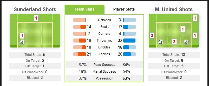 Cuối hiệp 1, Sunderland còn có một pha tấn công gây sóng gió cho cầu môn của Quỷ đỏ. Đáng tiếc cho đội chủ sân Ánh sáng khi Giaccherini đệm bóng đi vọt xà ngang trong tư thế không bị kèm. Kết quả bất lợi sau 45 phút đầu buộc MU phải chơi tích cực hơn trong hiệp 2. Phút 55, Januzaj đệm bóng gỡ hòa cho đội khách sau đường chuyền vào từ bên cánh trái của Patrice Evra.