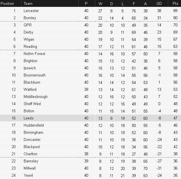| BXH sau vòng 40. 2 đội đứng đầu giành vé trực tiếp lên chơi Premier League. 4 đội xếp từ thứ 3-6 chia cặp đá thể thức play-off để chọn đội thứ 3 thăng hạng. |