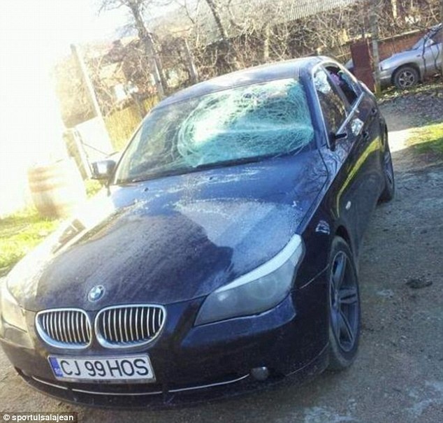 | Kính chắn gió trên xe của Wilton cũng bị nhóm trai làng băm nát. |