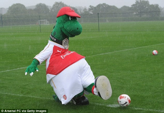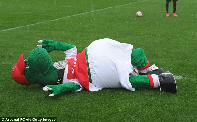 | Chú linh vật hình cá sấu của Arsenal có tên Gunnersaurus cũng thử tài cùng Arteta và đồng đội. Tuy nhiên, thân hình cồng kềnh khiến Gunnersaurus ngã nhào và dứt điểm không thành công. |