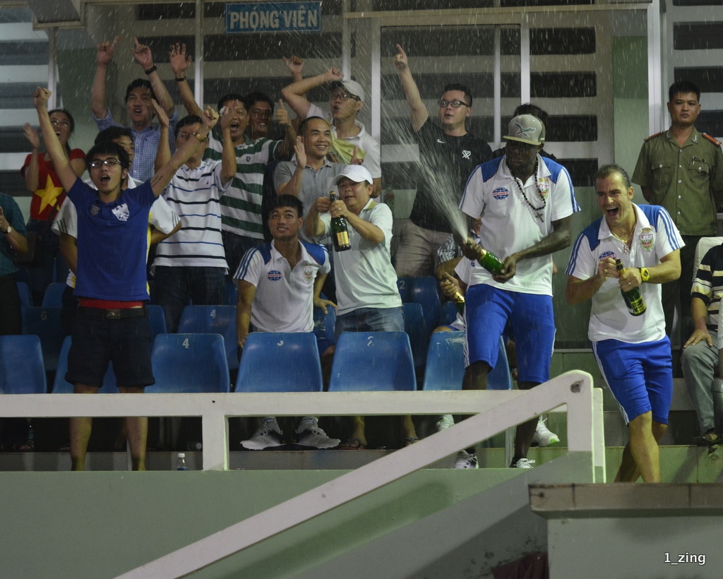 Cầu thủ B.Bình Dương khui champagne trên sân mừng chức VĐ