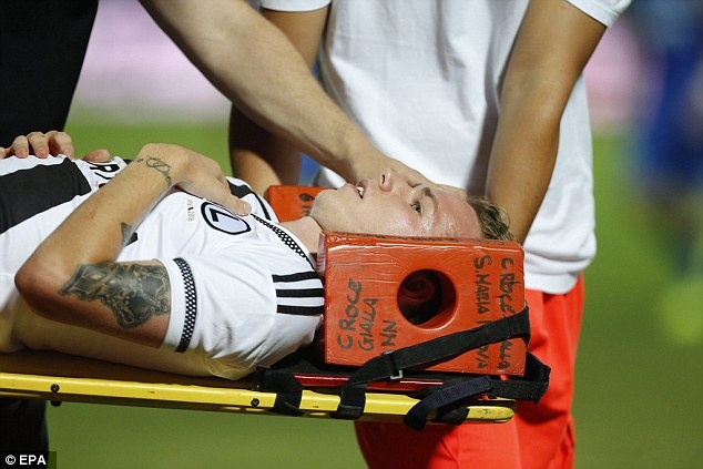 | Tiền vệ Ondrej Duda trở lại sân với băng quấn quanh đầu sau khi nhận được sự chăm sóc của các bác sĩ. |