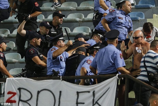 | Cảnh sát phải lên khán đài nhằm trấn áp những CĐV quá khích. Sự kiện này sẽ khiến đội bóng của Albania nhận án phạt nặng từ Liên đoàn bóng đá châu Âu (UEFA). |