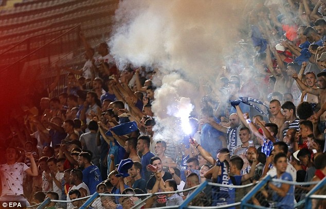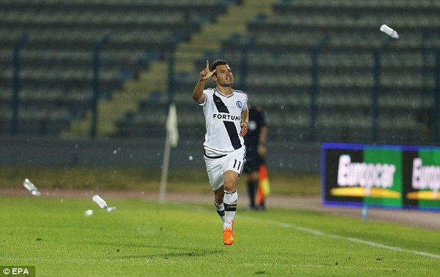 | Trước khi trọng tài cho dừng trận đấu, Nemanja Nikolic mở tỷ số cho Legia Warszawa ở phút 29. Khi anh ăn mừng bàn thắng, CĐV của đội chủ nhà ném chai nước xuống sân về phía anh. |
