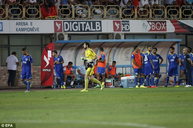 | Ở hiệp 2 trong trận đấu giữa chủ nhà Kukesi và Legia Warsaw, tiền vệ Ondrej Duda của đội khách phải nhận tới sự chăm sóc của các nhân viên y tế sau khi bị cổ động viên (CĐV) bên phía đội Kukesi ném đá vào đầu. |