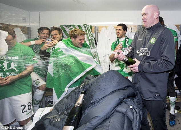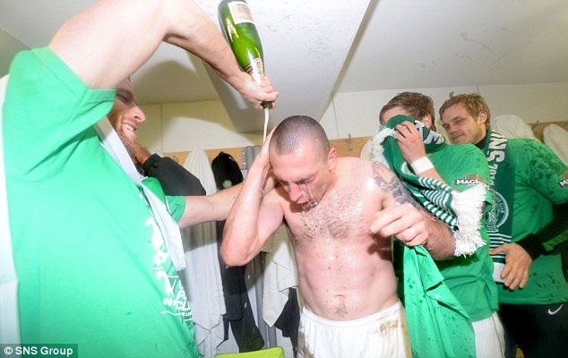 Đội trưởng Celtic Scott Brown cởi trần, đắm mình trong những màn dội bia mừng chiến thắng của đồng đội. |