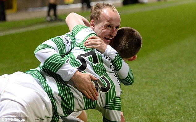 Leigh Griffiths và Liam Henderson ôm chặt nhau trên sân cỏ sau pha sút thủng lưới đối thủ mang về bàn mở tỷ số cho câu lạc bộ. |
