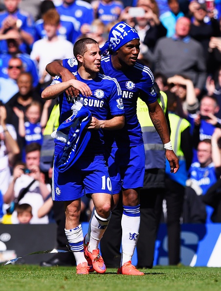 | Drogba chúc mừng người hùng Eden Hazard, cầu thủ hay nhất mùa giải vừa qua. |