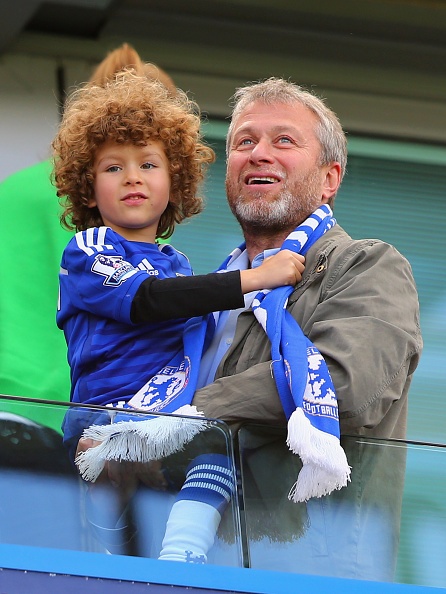 | Ông chủ Roman Abramovich "cười như Liên Xô" trên khán đài khi bế cậu quý tử mừng thành công. |