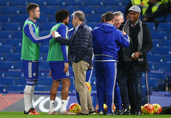| Ông chủ Roman Abramovich, tân HLV Guus Hiddink và huyền thoại Didier Drogba đến sân động viên cầu thủ. Ảnh: Getty. |