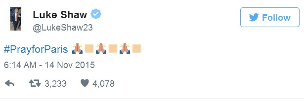 | Hậu vệ Luke Shaw của MU cầu nguyện cho các nạn nhân trong vụ xả súng ở Paris. |