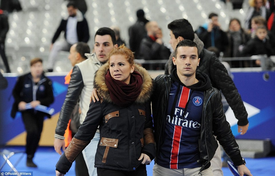 | Người hâm mộ có mặt tại sân Stade de France (Paris, Pháp) hoảng sợ sau khi có nhiều người thiệt mạng trong vụ xả súng. Ảnh: Offside. |