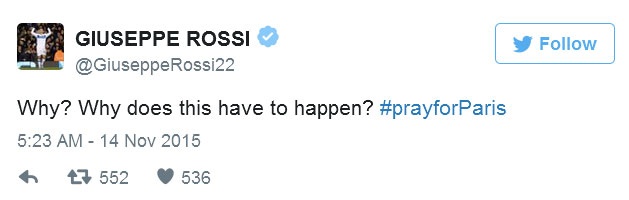 Trong khi, hậu vệ phải Gregory van der Wiel của đội bóng Pháp, PSG cho biết: “Thật là sốc khi nghe tin vụ xả súng ở Paris. Tôi gửi lời chia buồn tới những người bạn, gia đình của họ’. Còn tiền đạo người Italy, Giuseppe Rossi lại đặt câu hỏi: “Tại sao? Tại sao chuyện này lại xảy ra?”