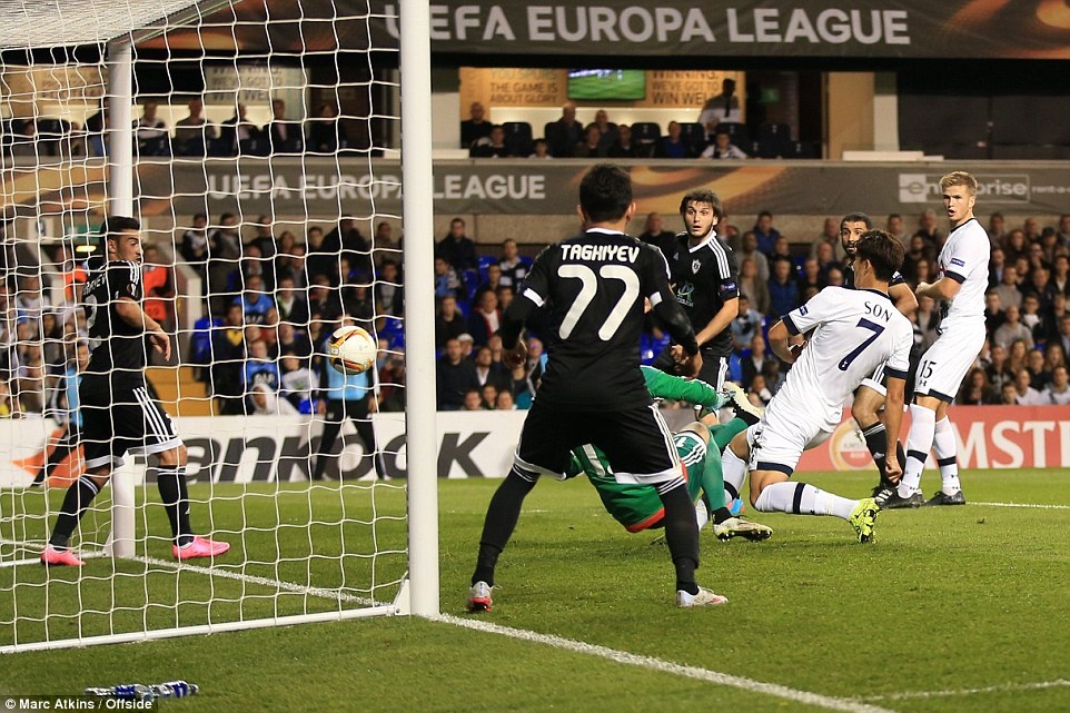 Từ pha phạt góc bên cánh phải của Townsend ở phút 28, Son Heung-Min nhanh chân đệm bóng cận thành trước sự bất lực của thủ môn Ibrahim Sehic bên phía Qarabag FK.