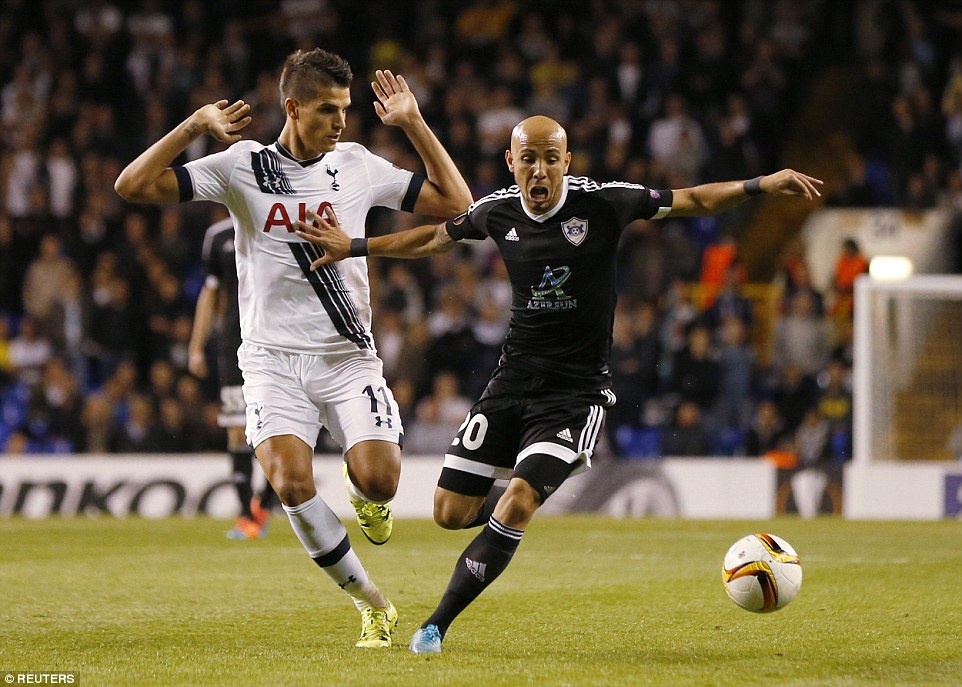 Phút 52, Tottenham có cơ hội gia tăng cách biệt, nhưng Lamela dứt điểm chân trái đưa bóng tìm đến cột khung thành Qarabag FK.