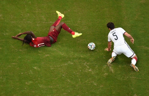 | Eder nằm vật ra sân sau pha tranh cướp bóng với Hummels. |