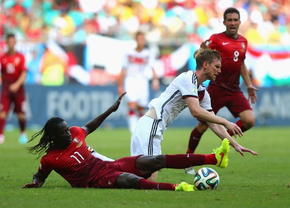 | Trung vệ tuyển Bồ Đào Nha lao tới chạm nhẹ vào đầu Mueller. |