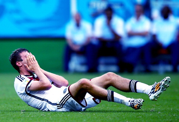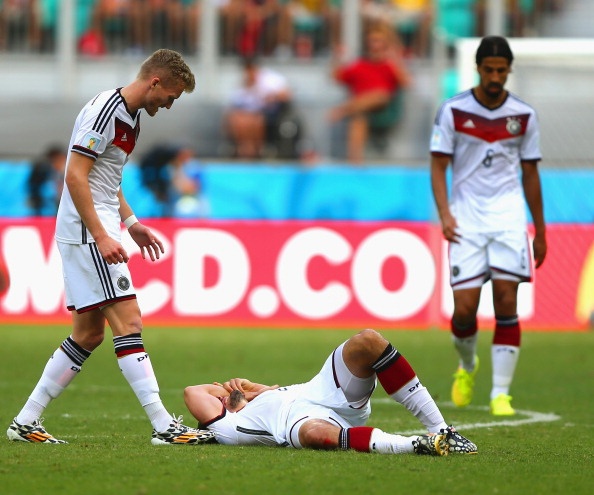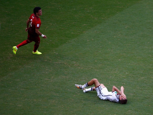 | Trung vệ Hummels của Đức ôm mặt đau đơn sau khi đầu gối của anh lao thẳng xuống mặt cỏ trong một pha tranh chấp với cầu thủ đối phương. |
