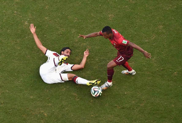 | Khedira ngã chổng võ khi tranh bóng với Nani. |