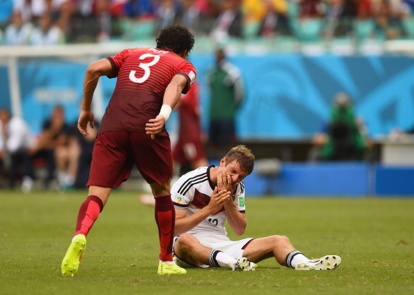 | Thomas Mueller ôm mặt đau đớn sau pha tranh cướp bóng với Pepe. |
