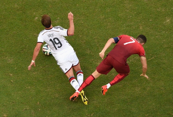 | Một pha tranh cướp bóng giữa Ronaldo và Mario Goetze. |
