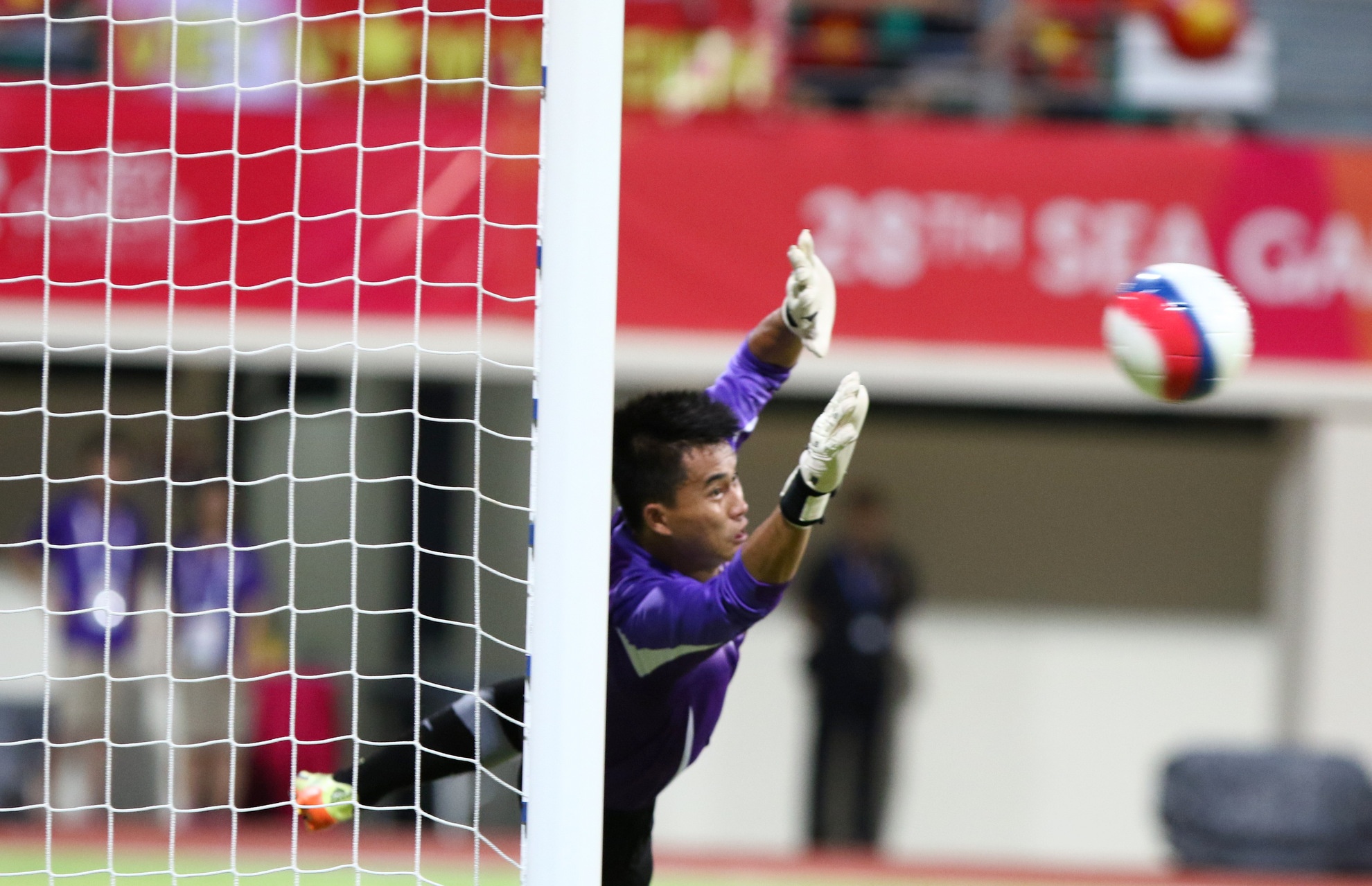 | Trên chấm 11 m, tiền vệ Thitipan ghi bàn giúp U23 Thái Lan nâng tỷ số lên 2-0. Thủ môn Văn Tiến đoán đúng hướng sút nhưng không thể ngăn được bàn thua. |