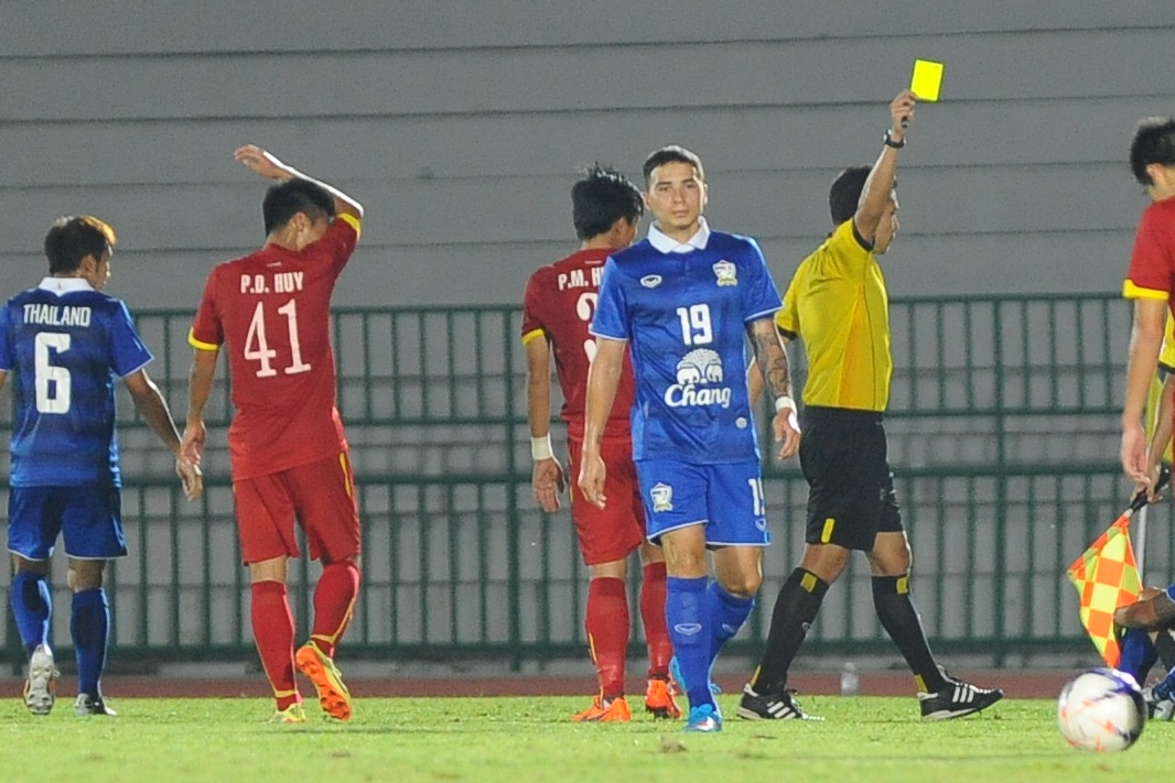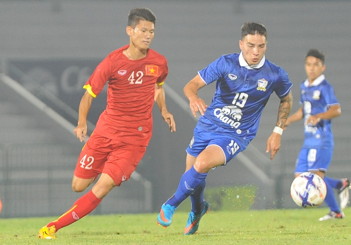 | Cầu thủ gốc Việt Tristan Đỗ (19) được HLV Kiatisak tung vào sân ở nửa cuối hiệp 2, trong thế Olympic Thái Lan đang dẫn trước Olympic Việt Nam với tỷ số 2-0. |