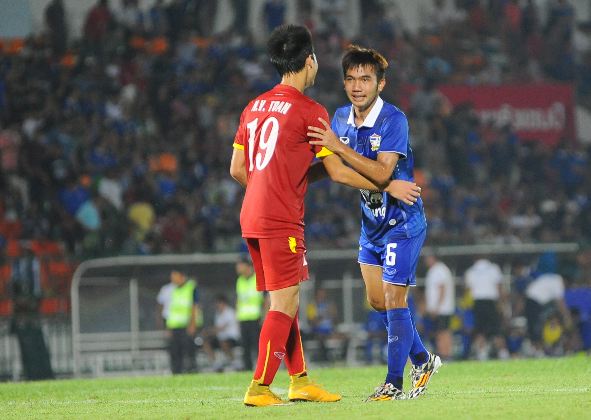 | Kết thúc trận thắng với tỷ số 3-1, cầu thủ Olympic Thái Lan tới động viên Văn Toàn và các đồng đội. |