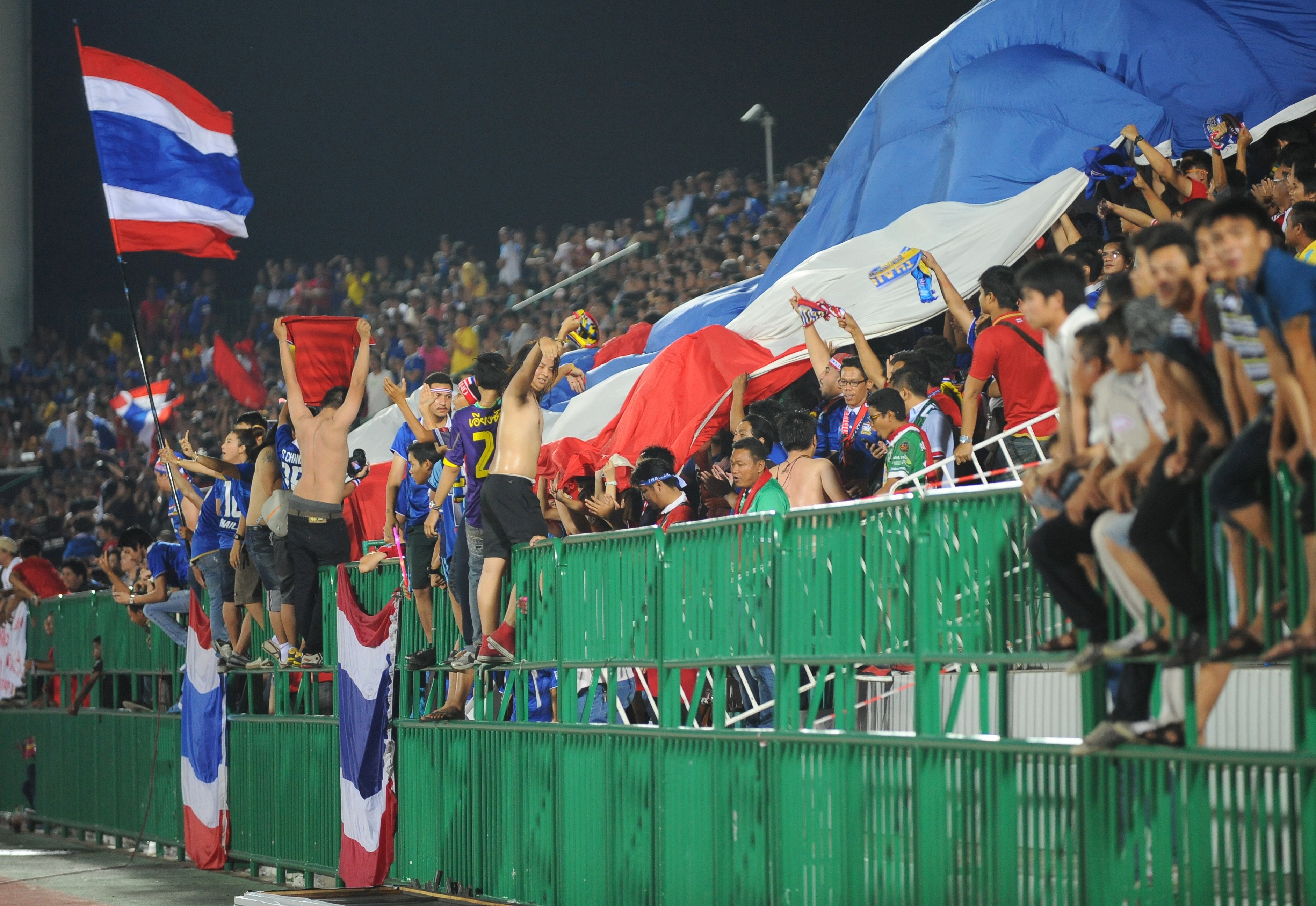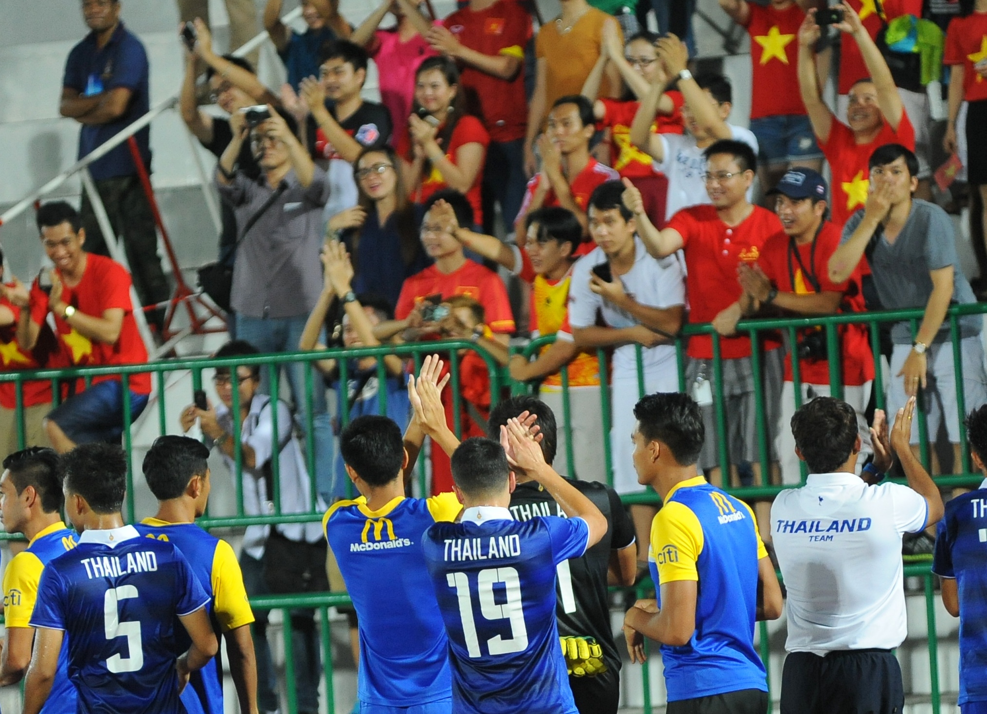 | Tristan Đỗ (19) cùng các cầu thủ Thái Lan chạy tới chào CĐV Việt Nam có mặt trên SVĐ Royal Thai Army. |