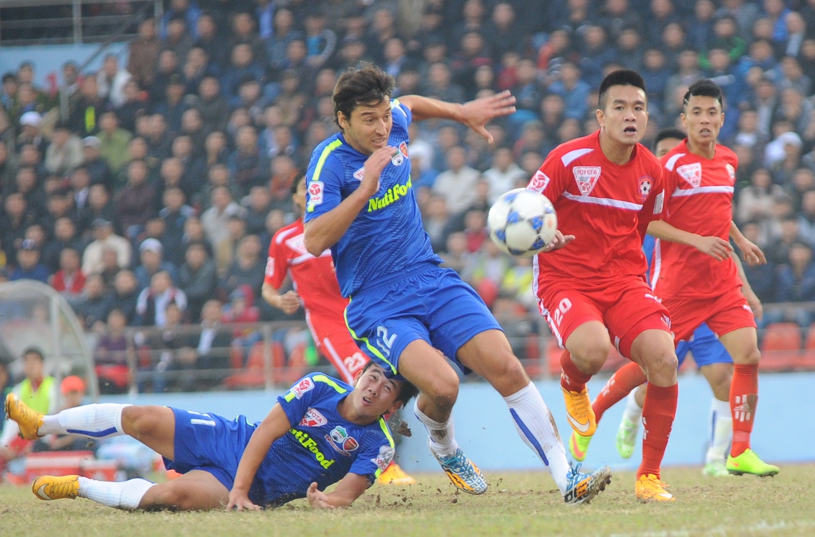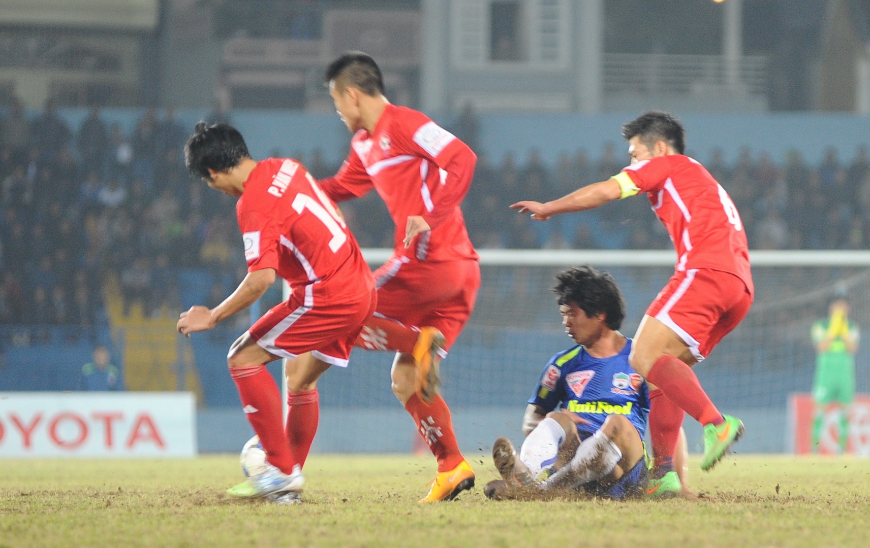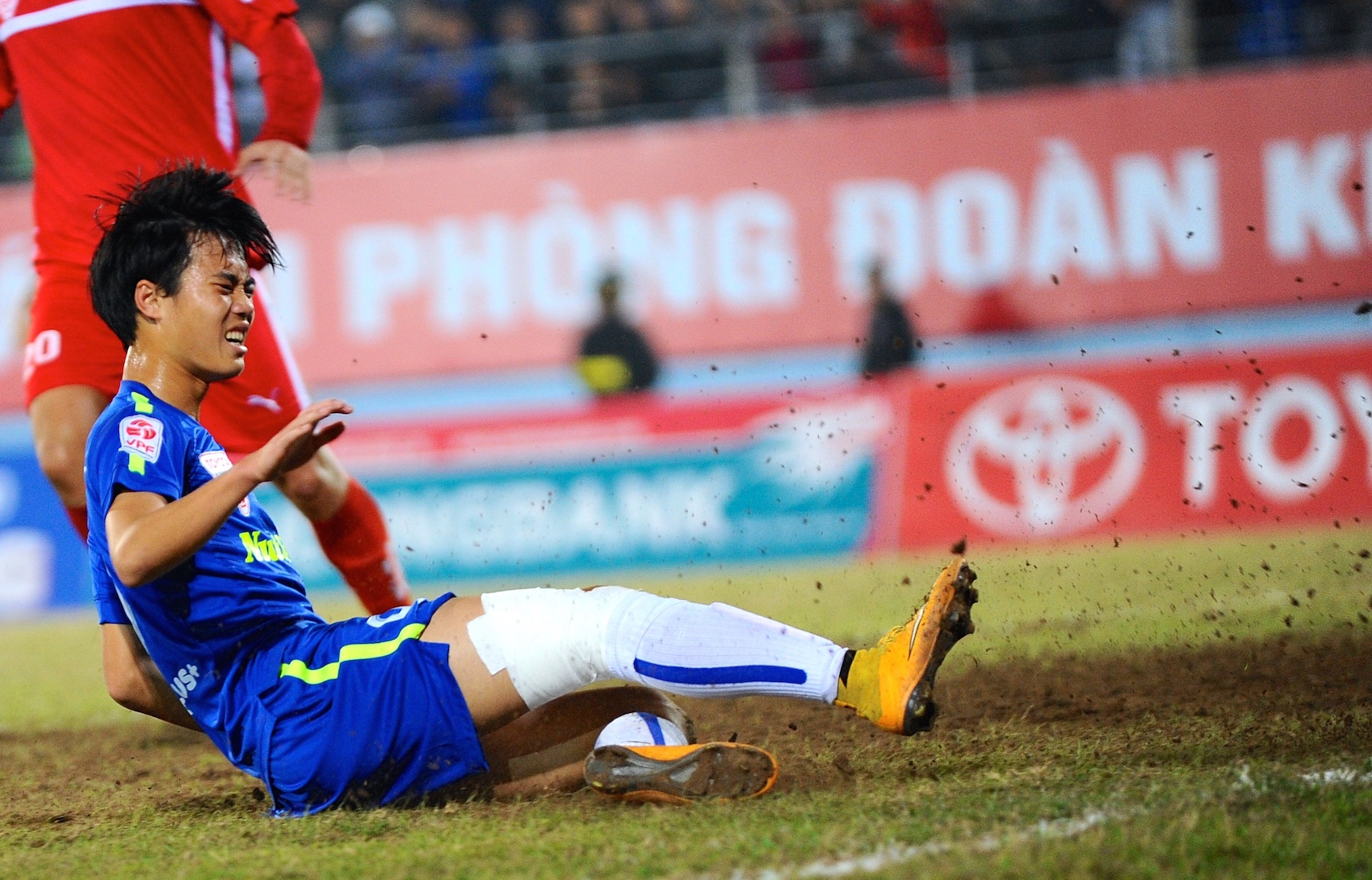 | Đế giày của tiền đạo Văn Toàn bị dính chặt bởi toàn đất và cát, điều này ảnh hưởng không nhỏ đến những pha xử lý bóng của các cầu thủ cả 2 đội HAGL và Hải Phòng. |